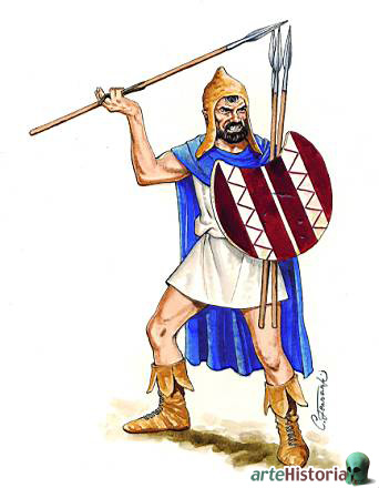 El armamento estaba formado por una lanza para el combate cuerpo a cuerpo, una espada corta recta o curva y un escudo redondo de madera reforzado con metal, abombado hacia afuera.